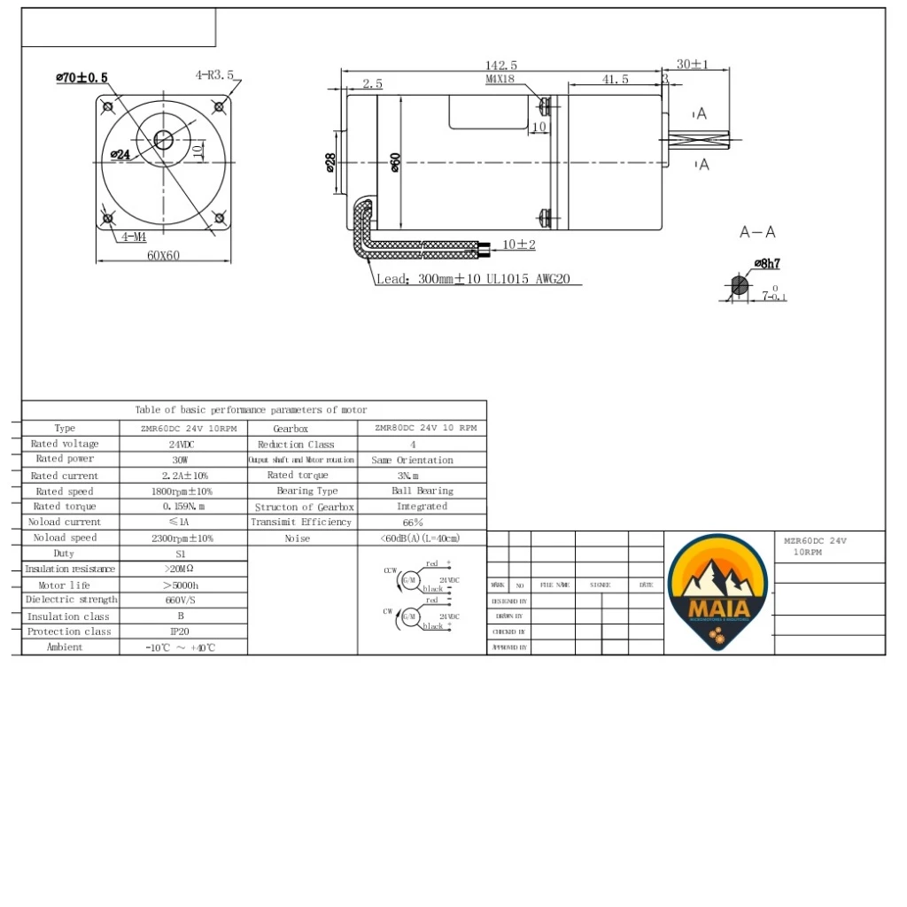 Disponível em duas especificações de saída (mesmo tamanho físico), com 24V DC e sentido de giro CW/CCW.